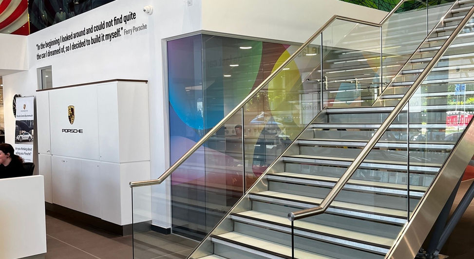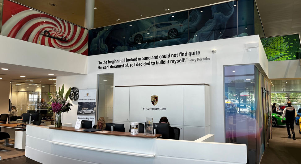 In June 2023, Inchcape Retail approached John E Wright & Co with a new project for their Bournemouth Porsche location. They required several large vinyl graphics to go on their mezzanine balconies inside their building.